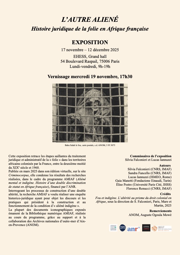 « Cette exposition parcourt les étapes saillantes du traitement juridique et administratif de la « folie » dans les territoires africains colonisés par la France, entre la deuxième moitié du XIXe siècle et 1960. Elle condense les résultats des recherches réalisées, dans le cadre du programme AMIAF (Aliéné mental et indigène. Histoire d’une double discrimination de statut en Afrique française), financé par l’ANR. Interrogeant les processus de construction d’une double altérité, la recherche AMIAF a voulu réaliser une enquête historico-juridique ayant pour objet les discours et les pratiques qui président à la construction et au fonctionnement de la condition d’« aliéné indigène » ».